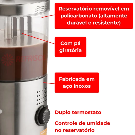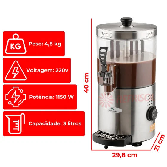 Chocolateira Marchesoni proporciona uma experiência de aquecimento eficiente, conferindo praticidade ao dia a dia na cozinha. Seu sistema de escape de vapor assegura que o processo de aquecimento seja seguro e controlado. O reservatório removível permite uma fácil limpeza e possibilidade de armazenar bebidas no refrigerador, se necessário. Com 1150 W de potência, ela oferece aquecimento rápido e eficiente para uma variedade de bebidas. Além disso, a estrutura robusta e design inovador tornam este equipamento uma escolha durável e confiável para o uso intensivo em ambientes industriais.